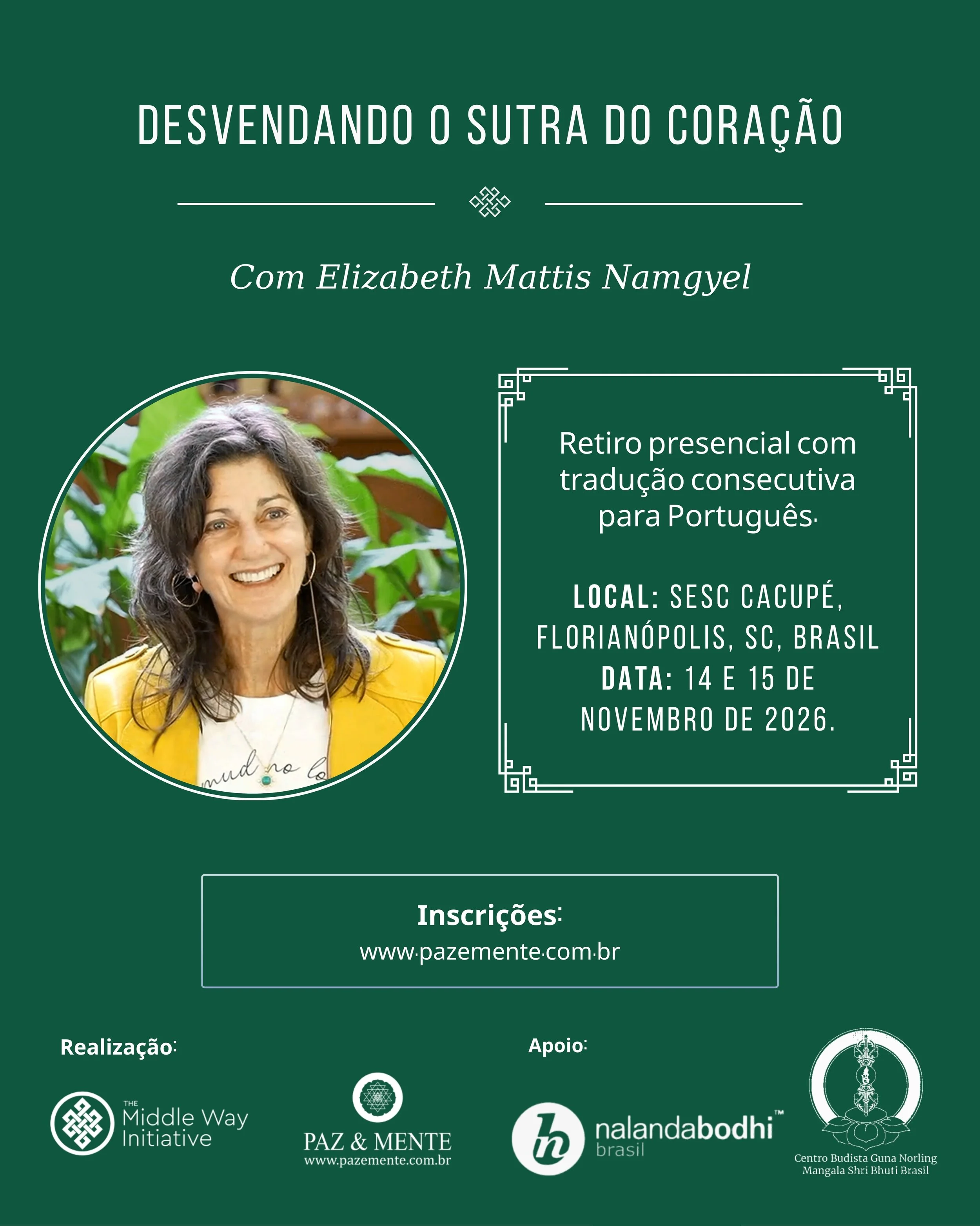 O Sutra do Coração é o ensinamento do Buda mais recitado no mundo. Muitos o entoam simplesmente a partir do coração da devoção — e isso, por si só, já é profundamente significativo. No entanto, as palavras do sutra são riquíssimas em significado e, quando as examinamos com atenção, revelam uma sabedoria capaz de transformar a maneira como percebemos a nós mesmos e o mundo em que vivemos. Elizabeth tem grande alegria em ensinar o Sutra do Coração. Para ela, a cada recitação e contemplação, o sutra revela algo novo e iluminador. Durante o encontro, ela apresentará o contexto histórico do sutra, explicará por que ele é tão importante e prático para o nosso bem-estar e nos conduzirá por uma exploração de seu significado mais profundo. O fim de semana incluirá ensinamentos, meditação guiada e recitação do sutra. Elizabeth aprecia muito a interação com seu público, portanto haverá amplo espaço para diálogo, perguntas e respostas, promovendo trocas significativas.
